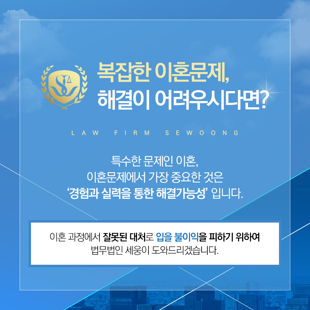 이혼은 결혼만큼 아니 결혼보다도 훨씬 더 힘든 과정이고 다양한 법률적인 문제들이 연관되게 되고 조금 더 슬기롭게 힘든 과정을 헤쳐 나갈 수 있도록 세웅의 가사상담센터에서 무료이혼법률상담을 통해 디테일한 내용과 이혼에 관련된 몇 가지 사항을 알려드리고자 합니다.