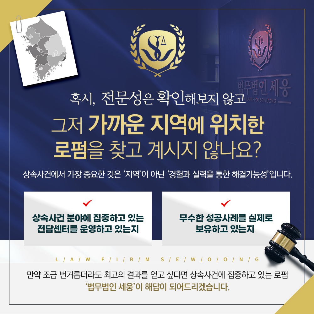 변호사를 선임할 때 많은 분들이 가장 최우선적으로 따지는 요소는 사람마다 다를 것입니다. 하지만 자신이 소송을 맡겨서 승소를 하여야 각종 소송비용을 보전할 수 있는 것은 당연한 사실입니다. 예를 들어 상속분쟁이 생겼으나 금전적인 문제로 가장 저렴한 비용만을 따지다가 막상 자신이 위탁하고 맡긴 법률대리인이 전문성이 부족해 패소를 하는 결과를 맞이한다면 자신은 상속변호사 수임료 선임비용을 허망하게 날리고 억울함도 해소하지 못하는 최악의 결과를 손에 쥐게 되지요.