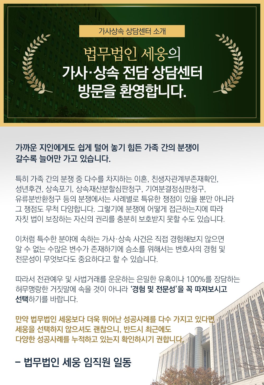 이렇게 상속기여분은 일정한 요건을 준수하여야만 인정받을 수 있습니다. 그래서 상속재산분할심판청구와 기여분결정청구를 하기 전에 반드시 상속전문변호사로부터 상속기여분소송의 전망에 관한 상담을 받아보셔야 합니다. 그래야 냉철한 이성을 가지고 절차에 임할 수 있습니다.