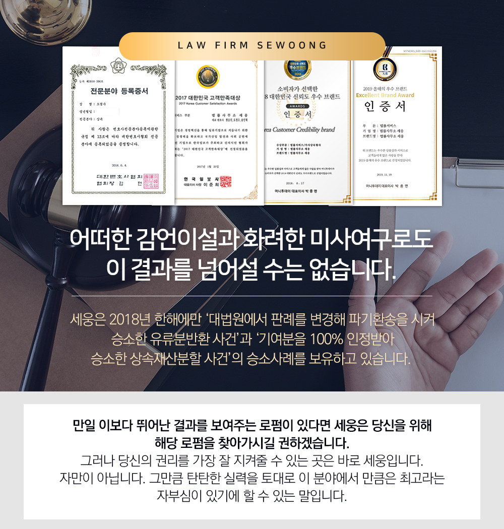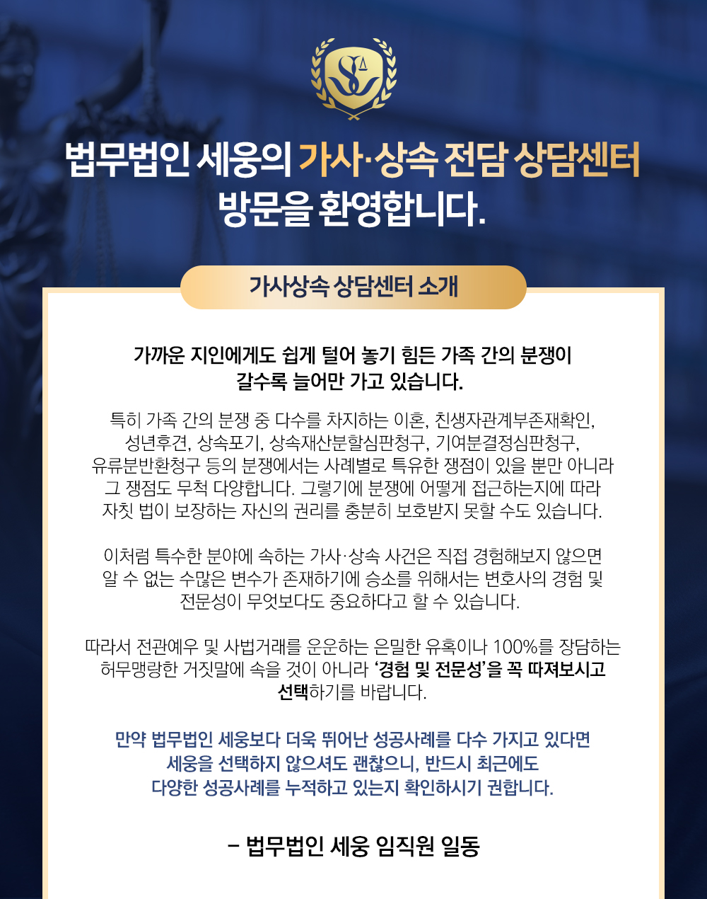 당신을 위한 가사상속전담센터는 상속유류분소송에 관하여 발생할 수 있는 모든 법률문제에 대하여 풍부한 경험을 가지고 있습니다. 방문 상담에 앞서 무료전화 상담을 이용해 보시기 바랍니다. 전문성이 떨어지는 사무장이 아닌 가장 사건의 이해도가 높은 상속법을 전문으로 하는 대표변호사가 전화 상담부터 방문 상담까지 모든 상담과 사건을 직접 진행합니다.