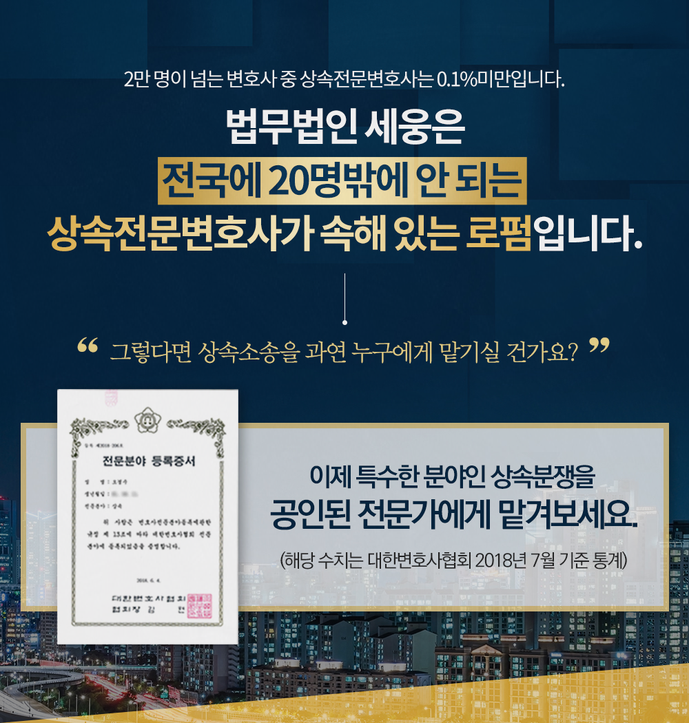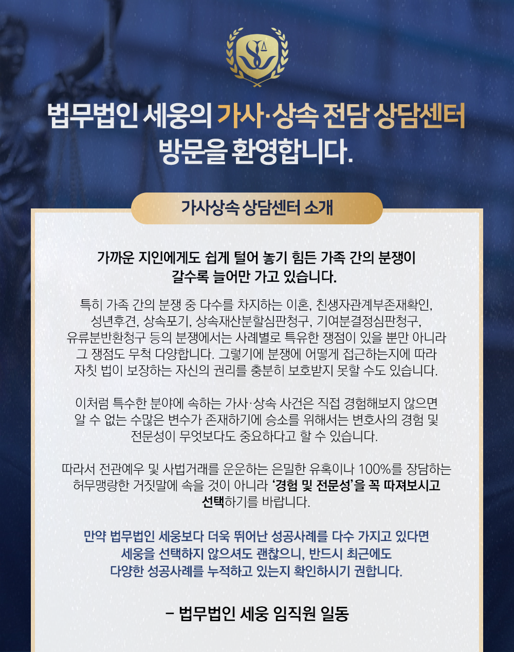 이처럼 각자가 처한 상황에 따라 거쳐야 할 절차가 있습니다. 하지만 이를 무시하고 무작정 등기신청을 진행할 경우 그 피해는 막대할 수 있지요. 따라서 많은 분들이 상속을 전문으로 하는 변호인에게 등기신청에 대한 위탁업무를 맡기는 것입니다. 만약 가장 안전하고 신속한 등기업무 진행이 필요하신가요? 세웅에 문의하신다면 당사자마다 다른 구체적인 사정에 맞는 가장 정확한 방법을 안내해드릴 것입니다.