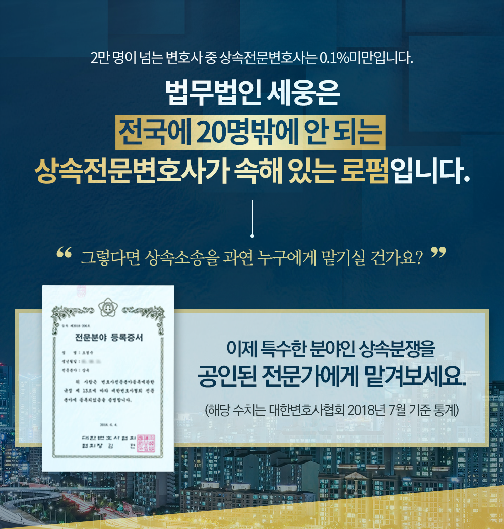상속분야에 전문성을 가지고 있고 자신의 일처럼 처리해줄 능통한 재산상속전문변호사를 찾는다면 우수한 변호인들이 포진된 가사상속상담센터를 만나보시기 바랍니다. 세웅은 상속분야에 특화된 변호사사무실로 상속전담센터를 운영하며 해당 분야의 다양한 경험을 가지고 있습니다. 합리적인 선임비용과 고품질의 법률서비스로 상속문제를 겪고 계신 분들을 도와드리겠습니다.
