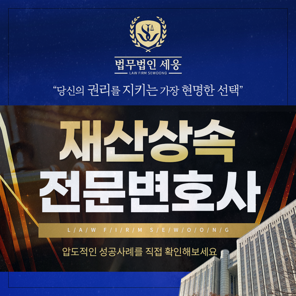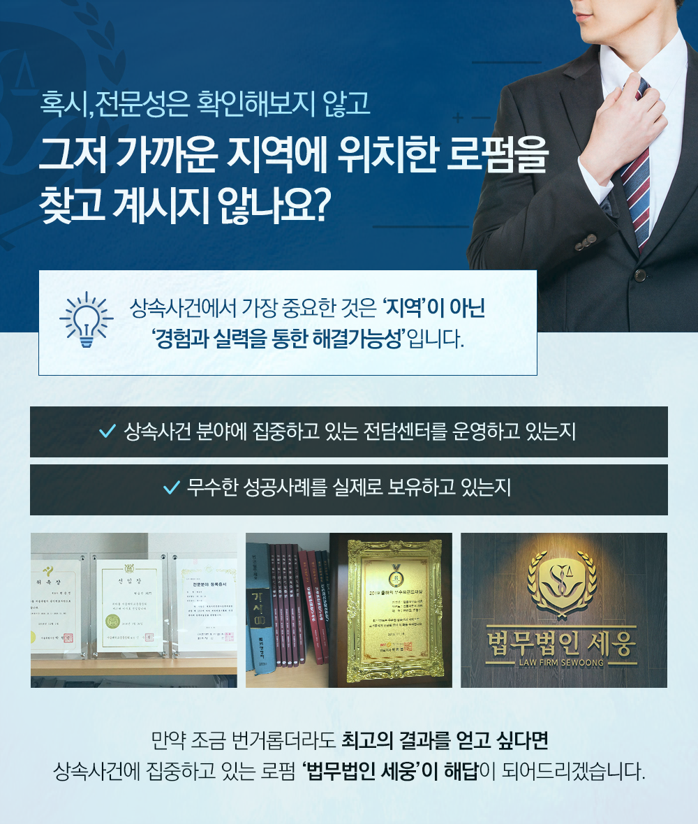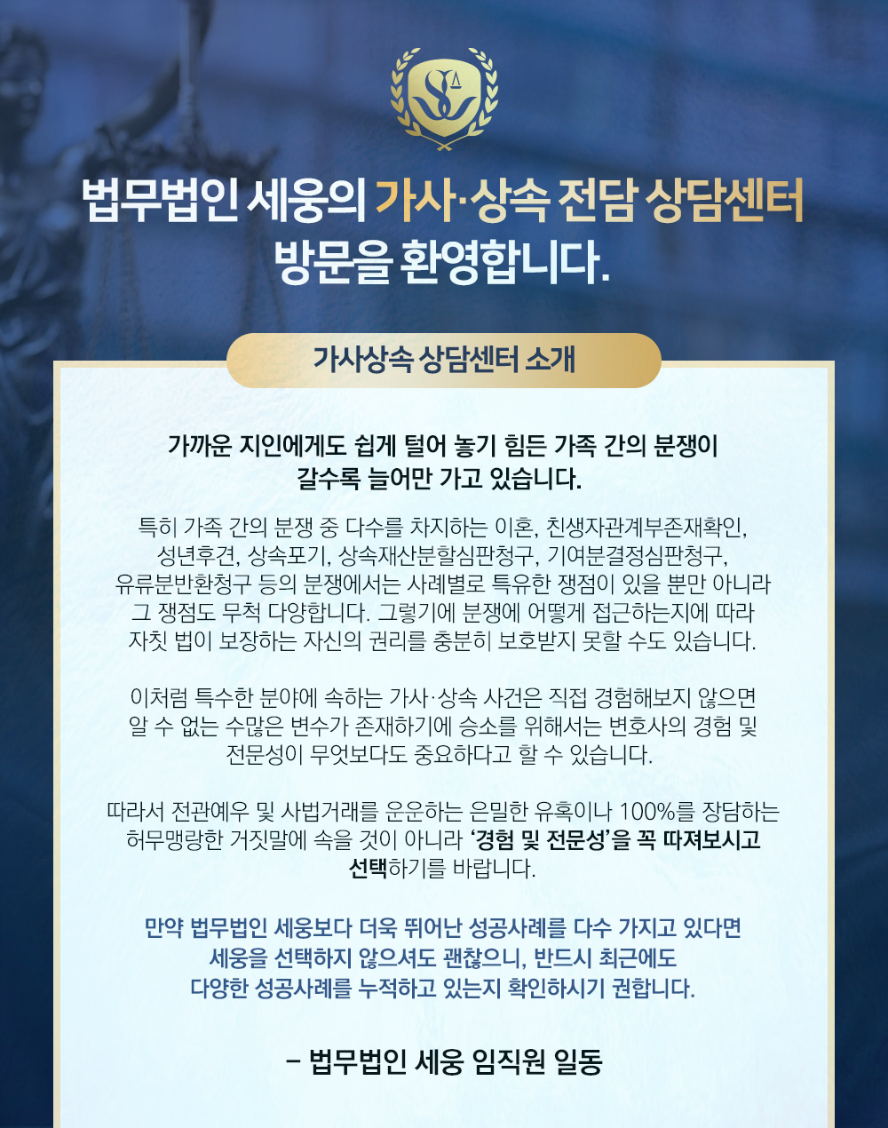 상속분야에 전문성을 가지고 있고 자신의 일처럼 처리해줄 능통한 재산상속전문변호사를 찾는다면 우수한 변호인들이 포진된 가사상속상담센터를 만나보시기 바랍니다. 세웅은 상속분야에 특화된 변호사사무실로 상속전담센터를 운영하며 해당 분야의 다양한 경험을 가지고 있습니다. 합리적인 선임비용과 고품질의 법률서비스로 상속문제를 겪고 계신 분들을 도와드리겠습니다.