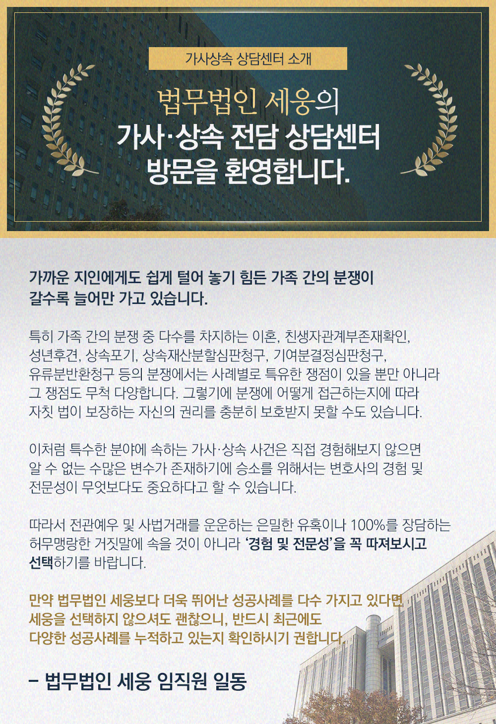 인지청구의소를 통해 과거의 양육비를 청구하거나 상속권을 주장하는 일은 상속소송 중에서도 매우 난이도가 높은 소송에 속합니다. 그러므로 인지청구의소를 준비하시는 분들은 법무법인 세웅 가사상속전담센터를 통하여 상담을 받아보고 자신이 행사할 수 있는 권리의 범위와 소송의 종류에 관하여 정확한 정보를 얻으시기 바랍니다.