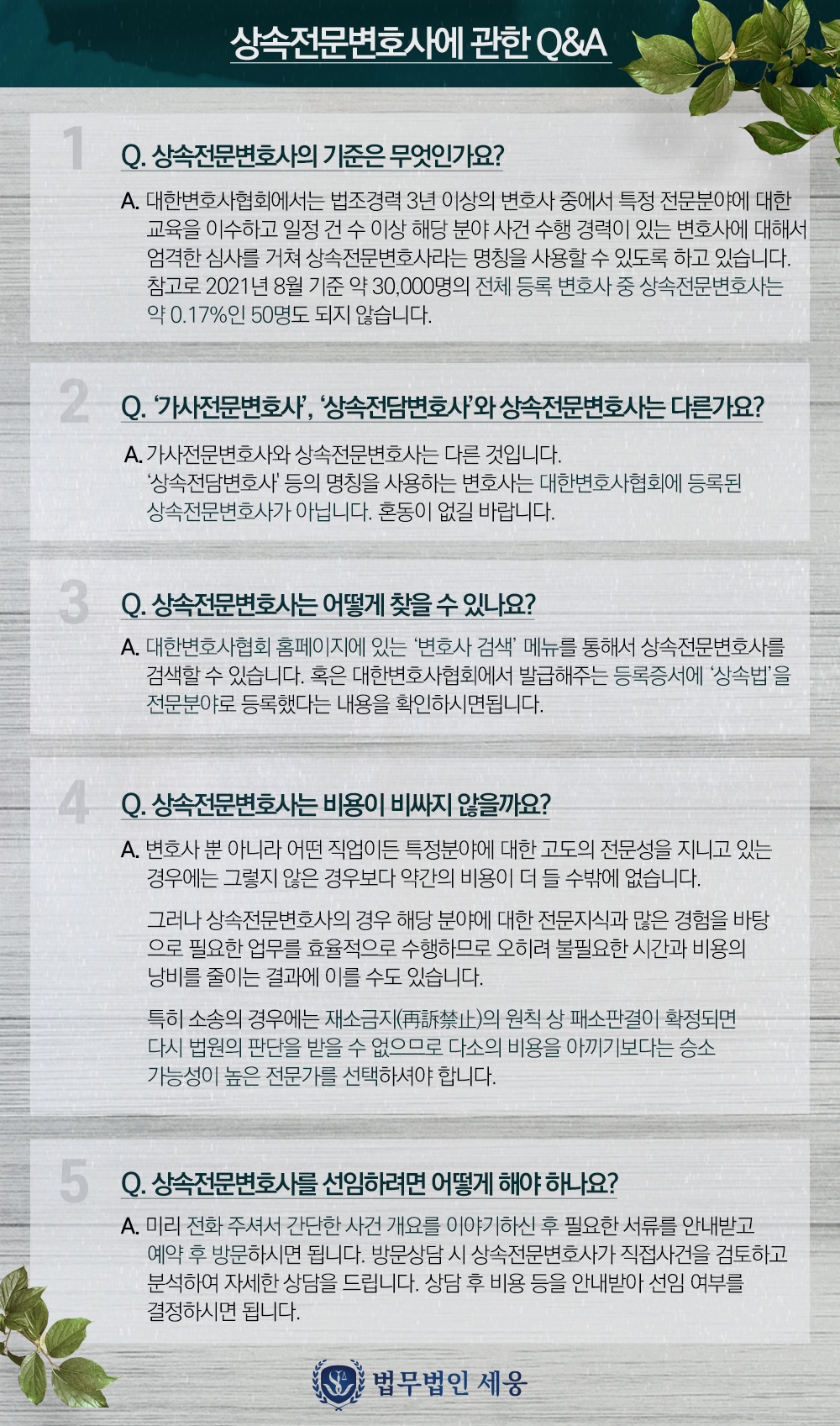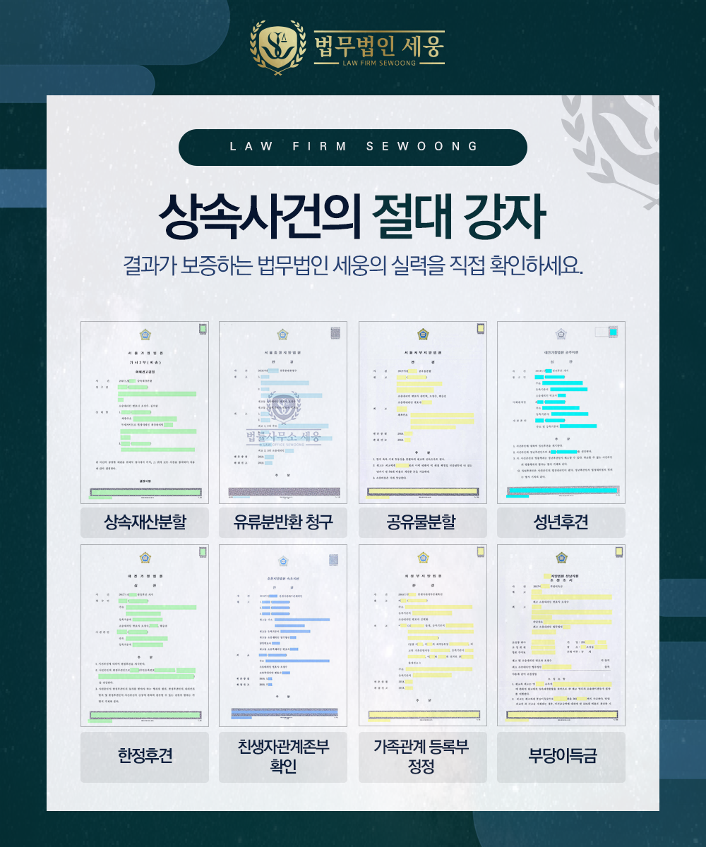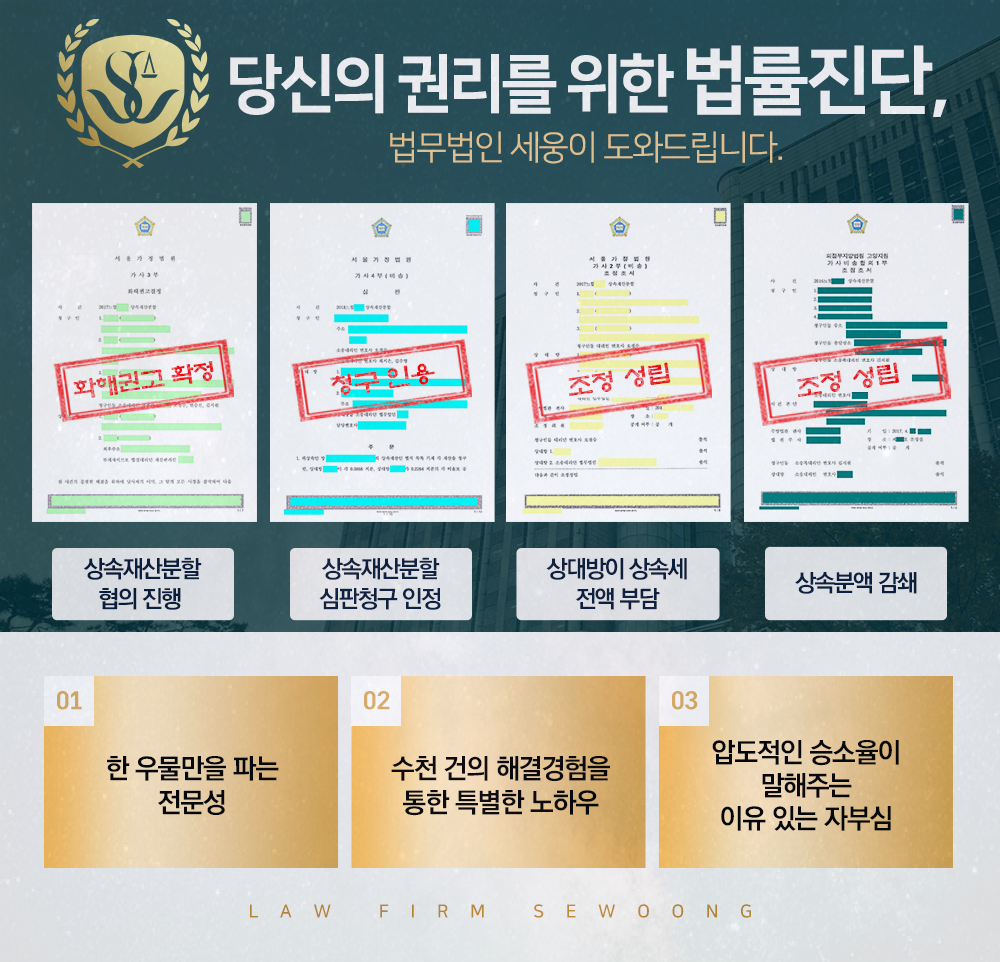 주식상속에서 가치평가를 위해서는 상증세법 상 관련규정을 정확히 알아야 함은 물론이고, 회사의 적극재산과 소극재산의 평가, 회사의 부실채권의 감정 등 여러 요소를 종합 고려하여야 합니다. 법무법인 세웅 가사상속전담센터는 전담 회계사와 전담 감정평가사를 두어 주식상속 등 상속과 관련한 제반 사안에 총체적인 도움을 드리고 있습니다.