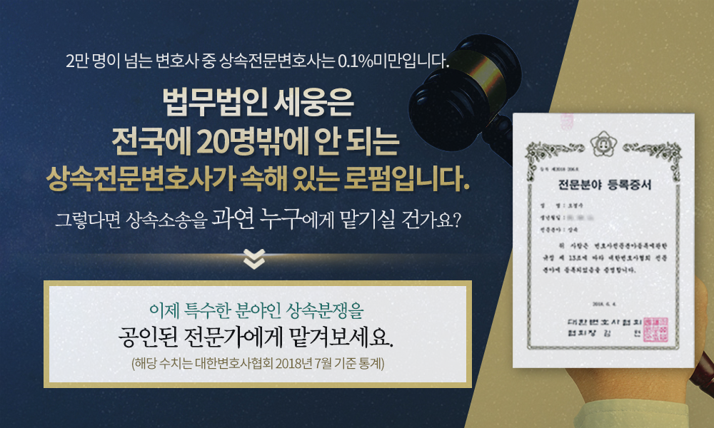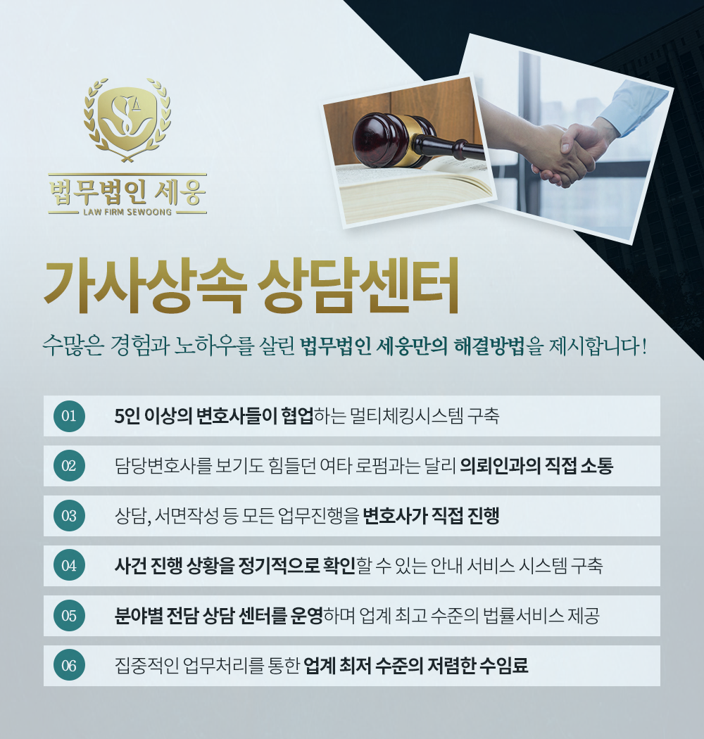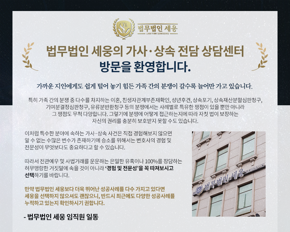법무법인 세웅 가사상속전담센터는 공유물 분할의 원인이 되는 상속, 이혼재산분할에 대한 전문성을 바탕으로 여러 공유물분할소송에서 의뢰인의 요구를 최대한 현실화하고 있습니다. 복잡하고 어려운 소송 문제로 골치를 썩고 있다면 부담 없이 무료상담을 요청하여 자문을 받아보기 바랍니다. 세웅에서는 확실한 답변을 위해 대표변호사가 직접 모든 상담을 진행하고 있으니 안심하셔도 됩니다.