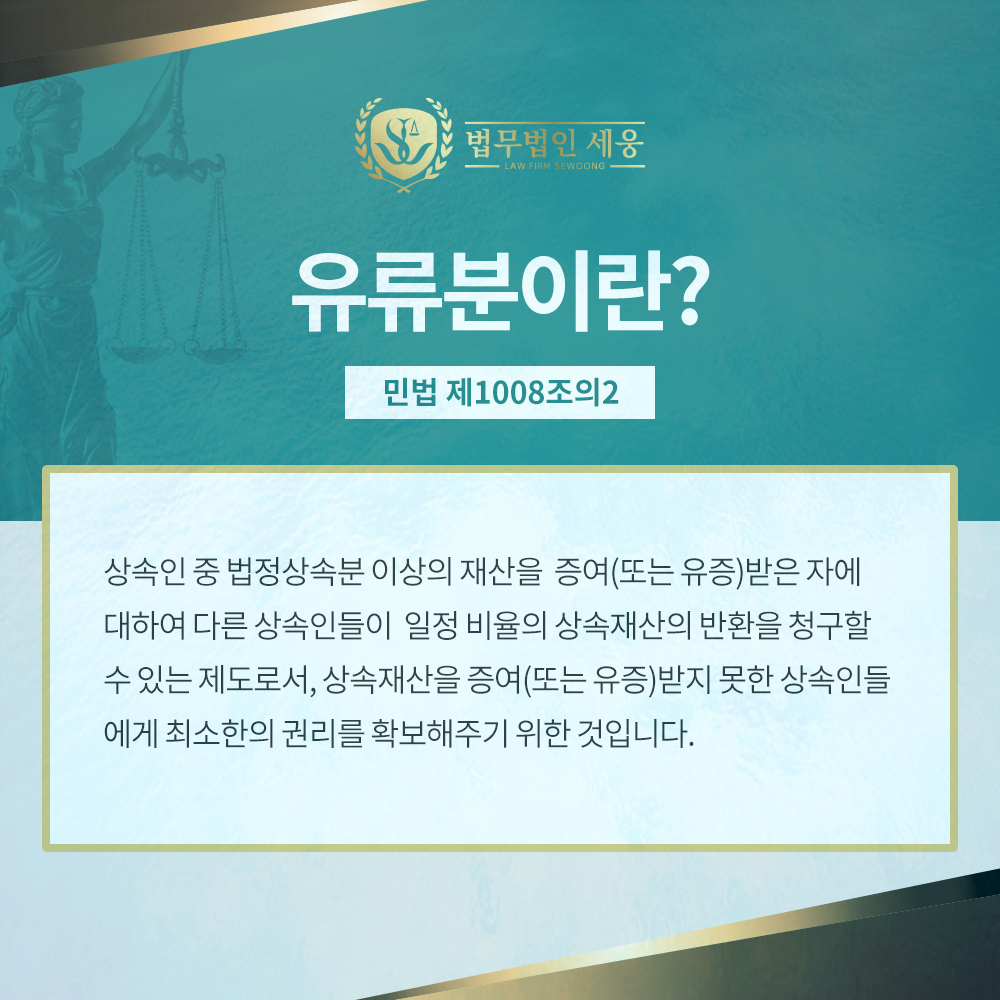 이렇게 피상속인의 유언의 자유와 상속인들의 상속에 대한 기대를 절충한 제도가 바로 ‘유류분반환 제도’입니다. 이 유류분반환 제도는 피상속인의 유언의 자유를 제한해서 상속인들에게 최소한도의 상속재산을 보장하려는 제도입니다. 이 유류분 제도가 있기 때문에 피상속인으로부터 재산을 받지 못한 상속인들도 상속재산의 일부를 받을 수 있습니다.