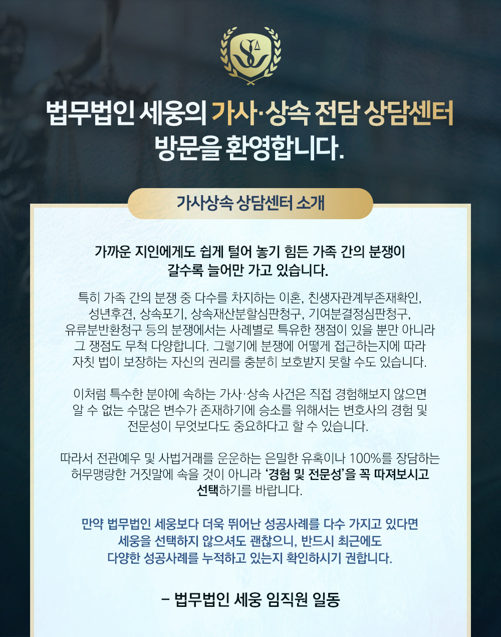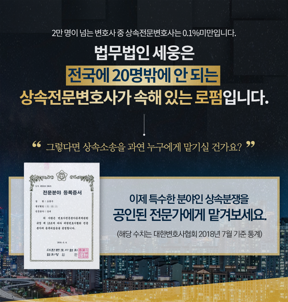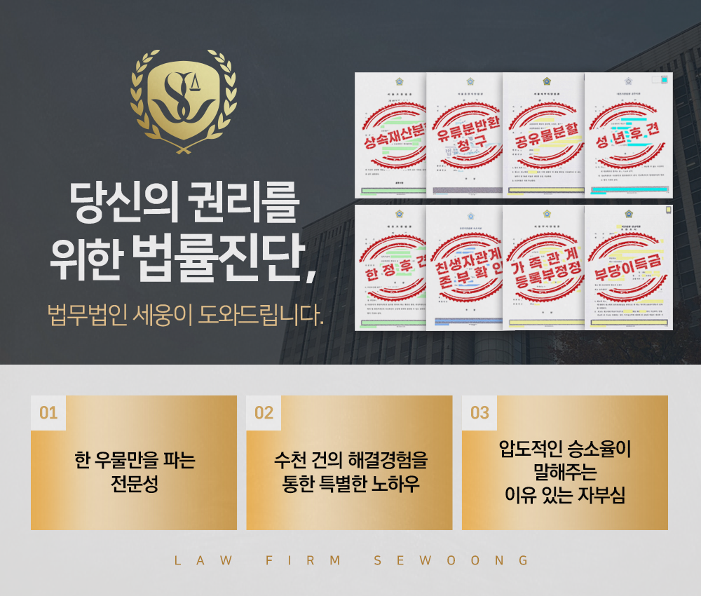 안녕하세요 법무법인 세웅의 가사상속상담센터입니다. 세상의 모든일이 다 원하는대로 된다면 참 좋겠지요. 그런 바람은 쉽지 않아 고난과 역경의 파도를 겪을 수밖에 없는 것이 인생인 것같습니다. 부모가 자식에게, 자식이 부모에게 바라는 것 또는 해주고 싶은 마음은 같지만 부모님 유산상속에 관해 안일하게 대처하다가는 큰 피해로 돌아올 수도 있습니다.