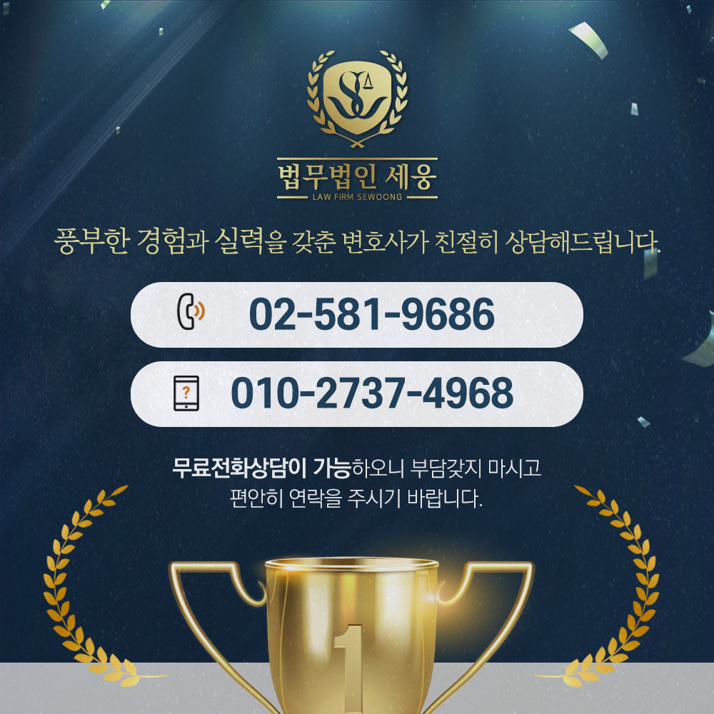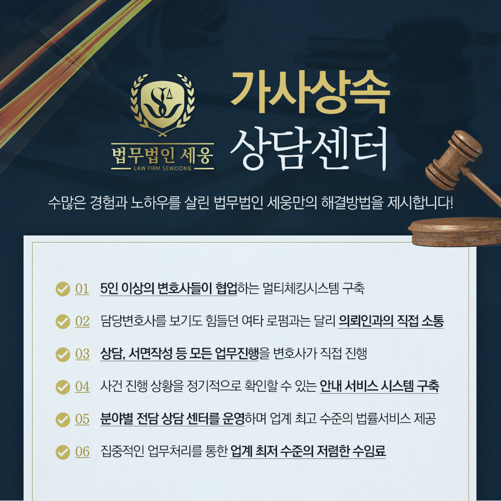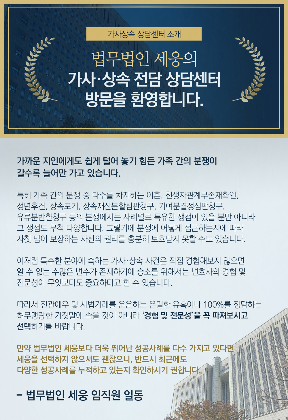 혹은 물리적인 다툼이 생겨 상상도 하기 어려운 극단적인 절차가 생기더라도 상속권리를 주장할 수 있도록 도움을 드리고 있습니다. 유산상속에서 어려운 점이 있으시다면 언제든지 세웅의 가사상속상담센터로 연락주시기 바랍니다. 유산상속절차로 생기는 어려운 법률절차를 상속전문변호사가 알기 편하게 설명 드리며, 성공적으로 이루어질 수 있도록 전문법률서비스를 제공해드리겠습니다.