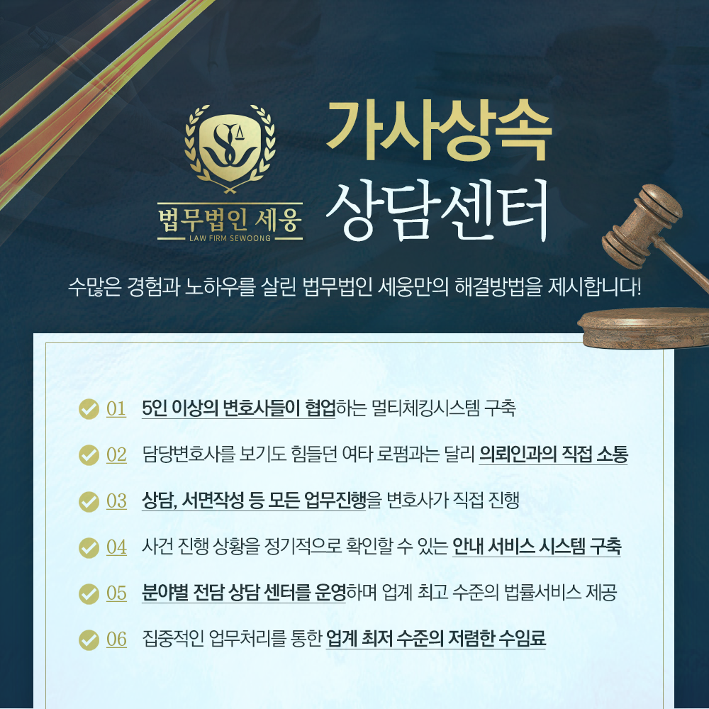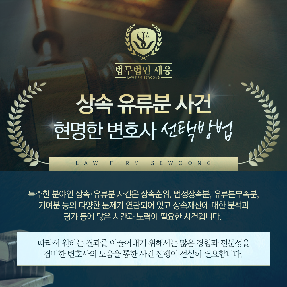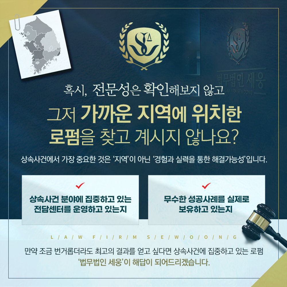 더불어 부동산, 세무, 법률적인 부분이 복잡하게 얽혀있는 상속의 문제인 만큼 반드시 상속변호사와의 상담을 통해 설명을 들으신 후 진행하셔야 합니다. 법무법인 세웅 가사상속전담센터는 유언상속 집행청구를 비롯한 다양한 유언소송의 경험을 바탕으로 여러분 곁을 찾아갑니다.