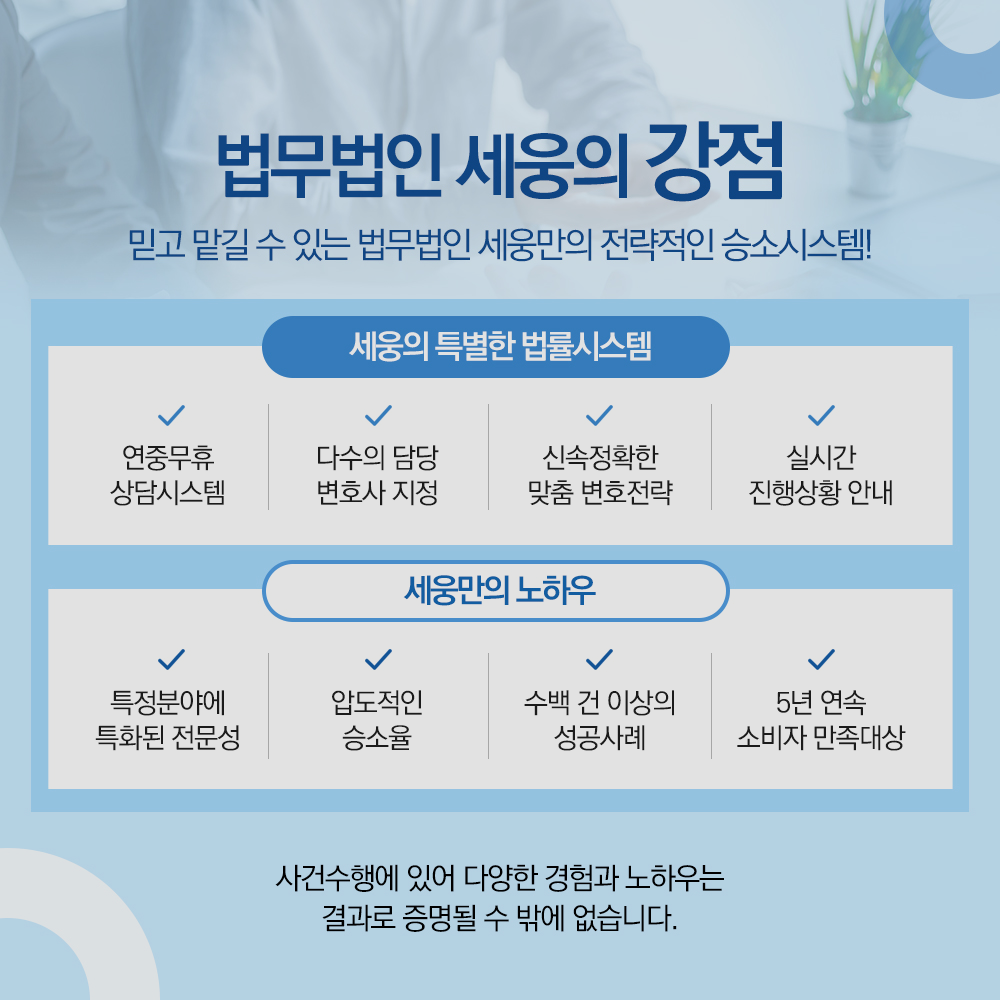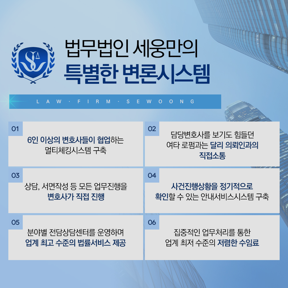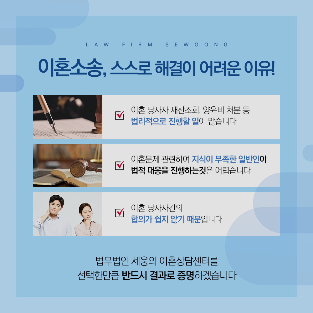 더불어 배우자의 폭행, 협박, 외도 등 일련의 사유로 혼인관계를 정리하기로 결심하고 위자료를 청구하는 것은 물론 자신의 기여분에 맞는 재산분할을 원하신다면 변호인과 자세한 이야기를 나누며 자신의 권리를 행사해보시기 바랍니다. 각종 판례 및 법령에 능숙하고 실무경험이 풍부한 전문가가 여러분의 권리행사를 도와드리겠습니다.