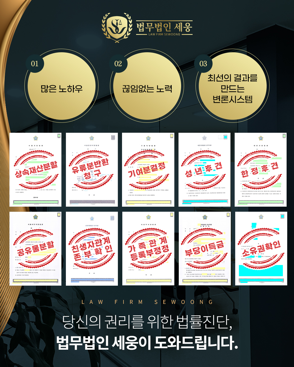 위와 같이 유산분할에 앞서서 유산상속 우선순위는 선결되어야 할 문제로서, 어떠한 재산이 과연 상속재산이 맞는가, 상속재산이라 하여도 혹시 공동상속인 간에 이미 상속재산분할협의가 있었던 것은 아닌가 등이 중요한 문제로 작용됩니다. 이러한 문제의 원만한 해결을 위해서는 반드는 상속전문변호사의 도움이 필요하니, 유산분할의 선결문제에 봉착해 있는 분이라면 지금 바로 세웅의 가사상속상담센터로 문의하시길 바랍니다.