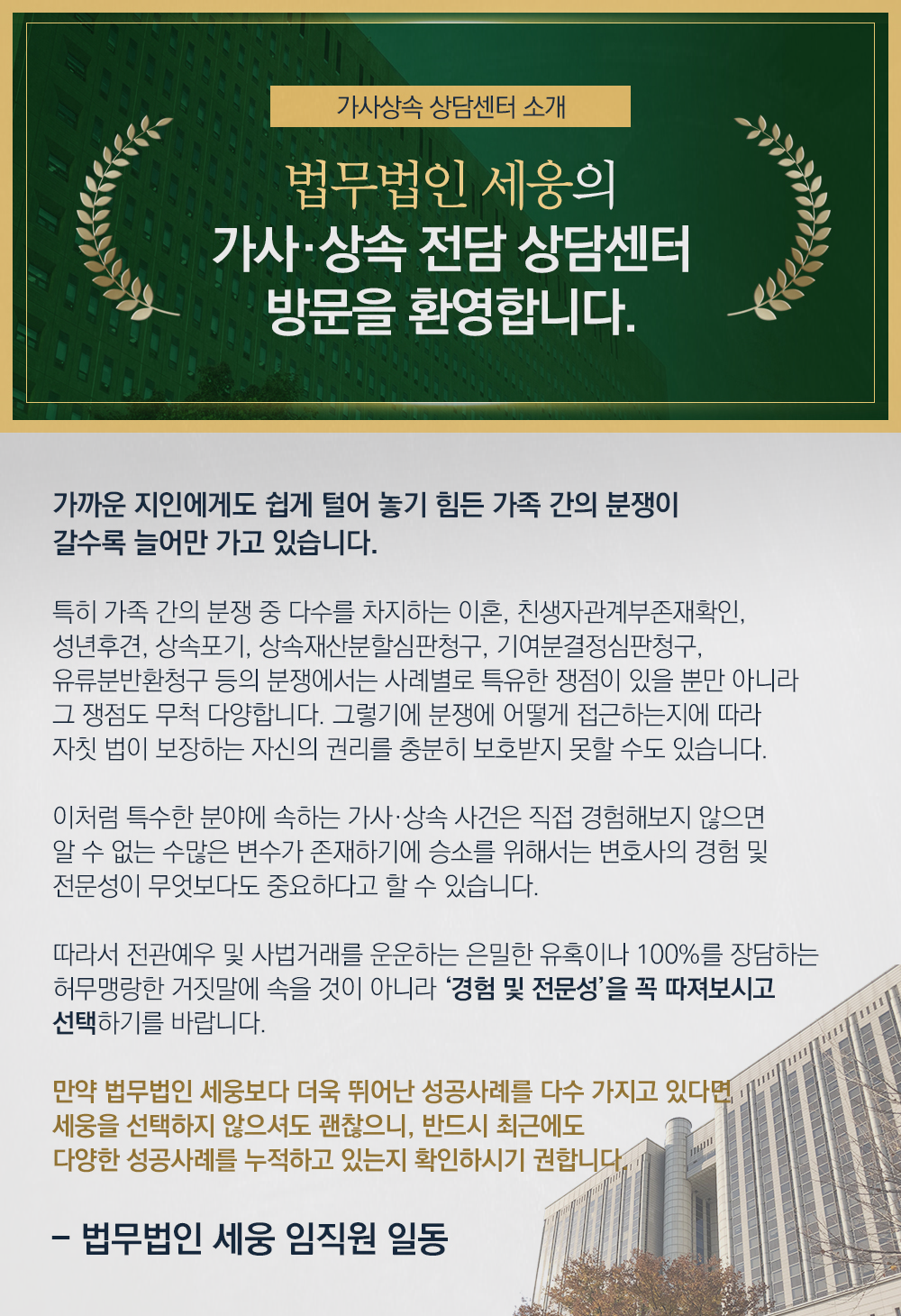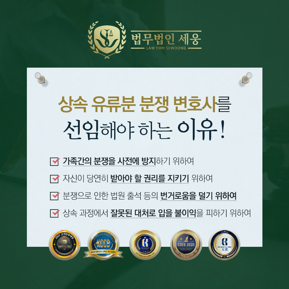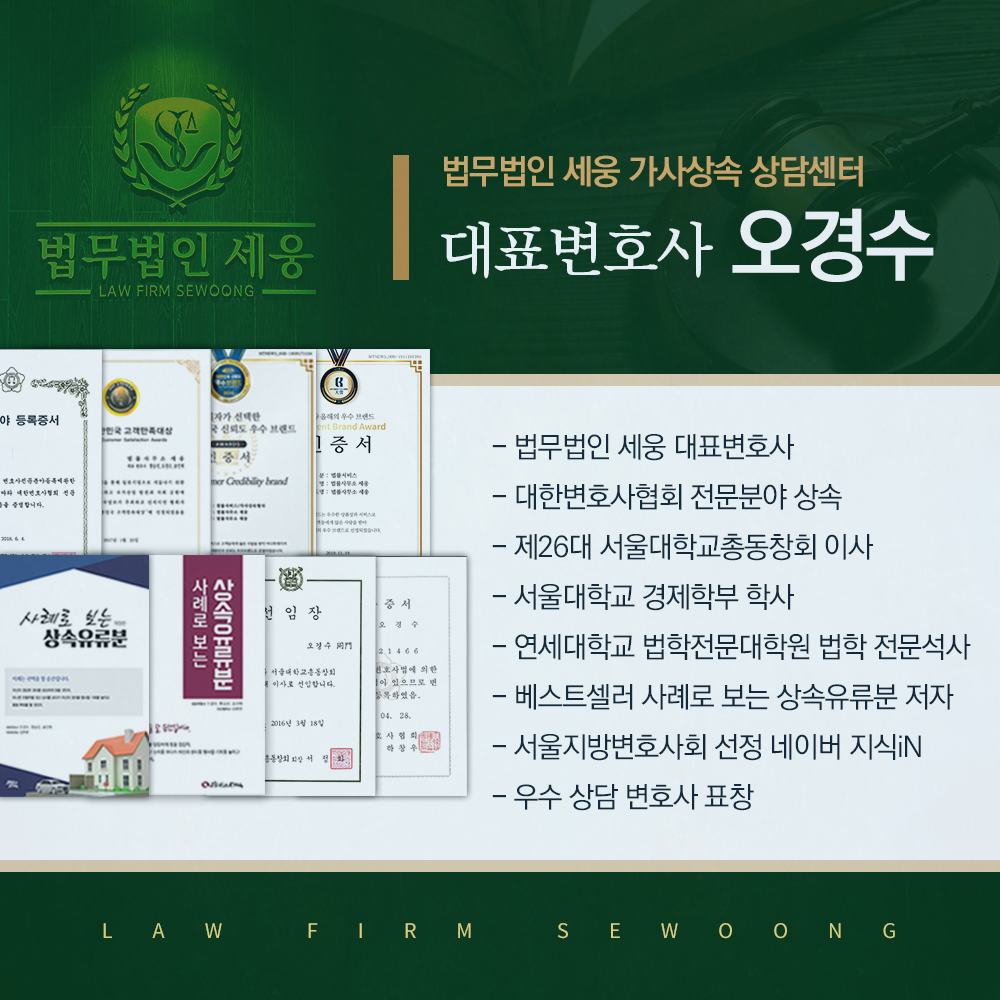 세웅의 가사상속상담센터는 수많은 재산유류분 반환순서 사건에 있어서 높은 전문성을 바탕으로 전화상담과 방문상담을 진행하고 있습니다. 신뢰할 수 있는 전문가와 원하는 결과를 얻고자 노력하시고 싶으신 분들은 언제든 환영하오니 성공사례를 직접 확인해보며 이야기를 들어보시기 바랍니다. 기대를 결과로 보답해드리겠습니다.