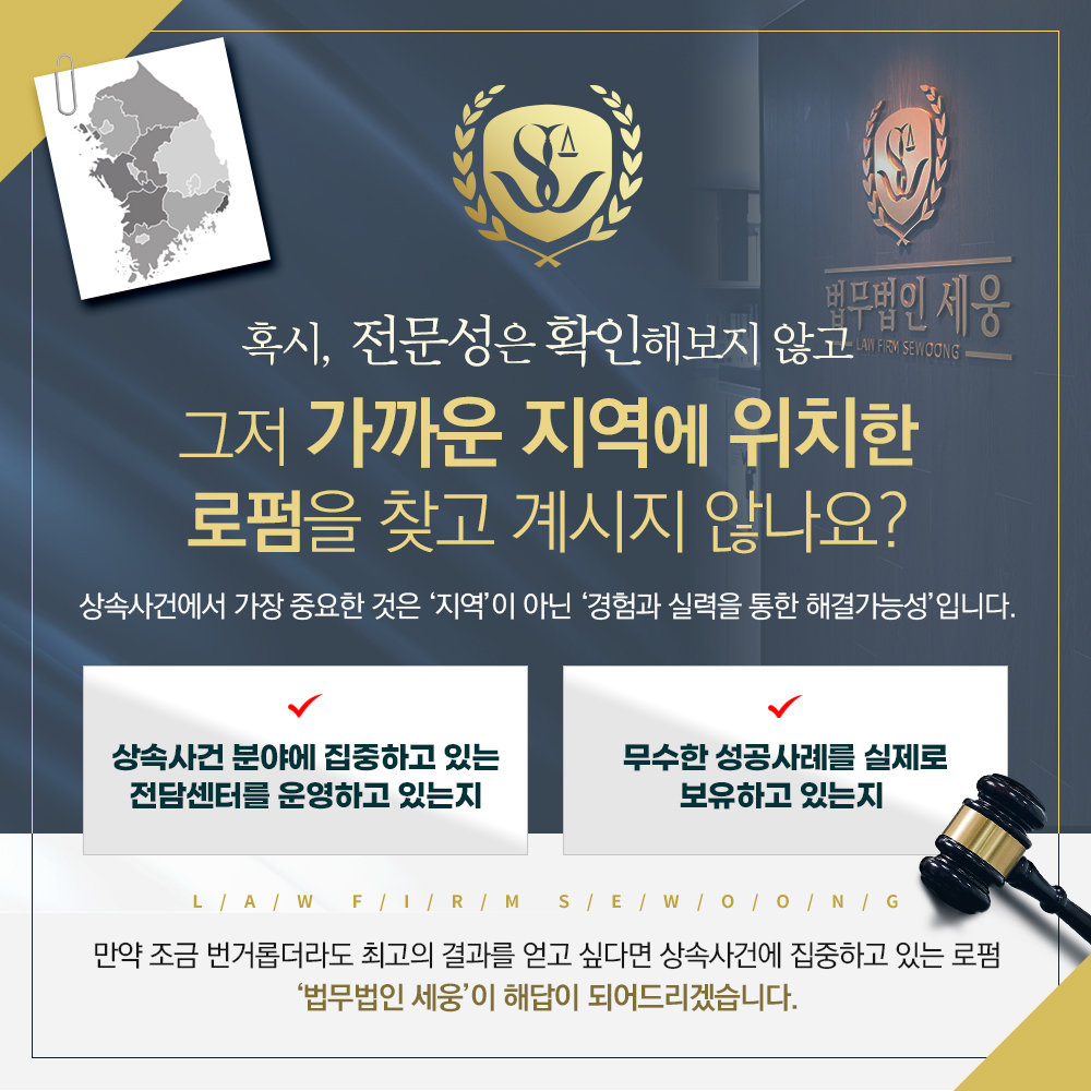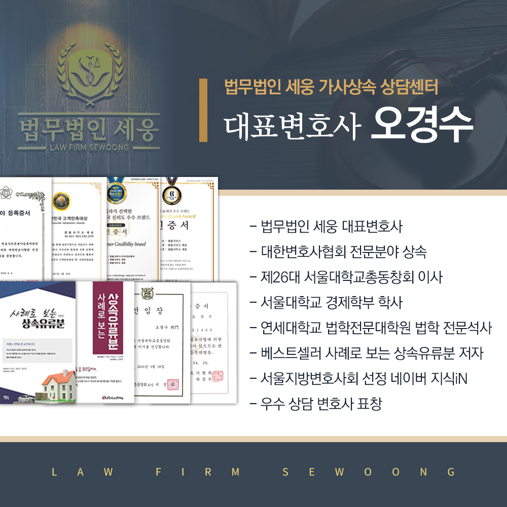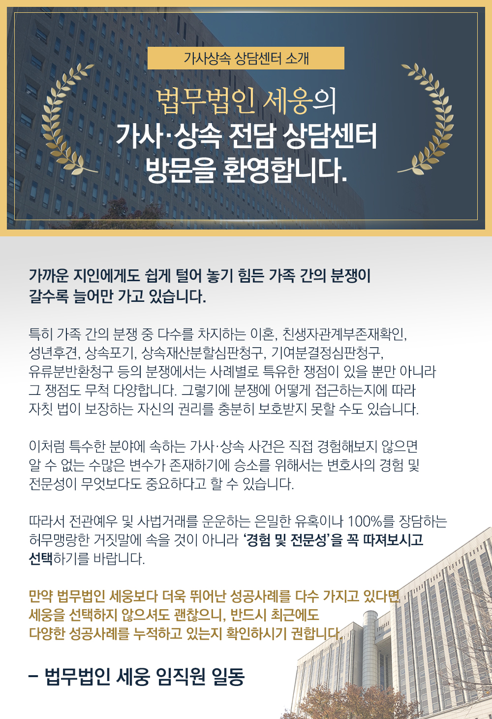 따라서 기여분 상속재산분할을 통하여 확실히 자신의 권리를 지켜내고 싶다면 당신의 전담상속변호인과 함께 철저한 준비를 해보실 것을 권합니다.