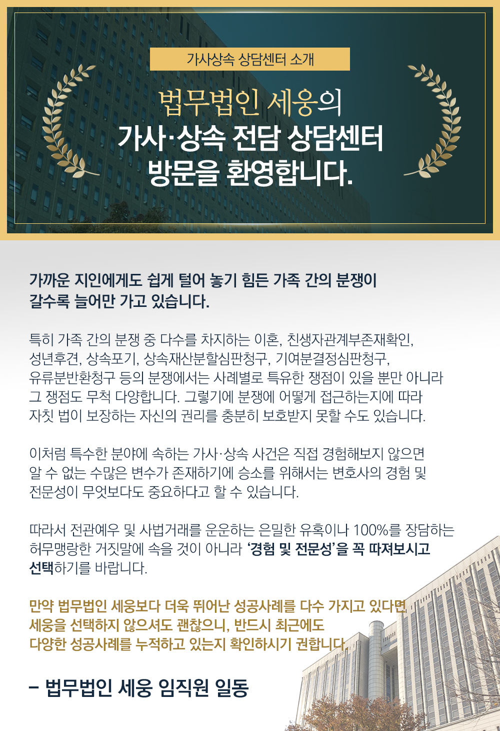 그리고 과연 재산상속법변호사가 맞는지 의문이 있으시다면 상속법을 전문분야로 등록했는지 확인하시고 상담을 받아보시기 바랍니다. 많은 법조인 중에 약 20명에 불과한 상속법전문변호사가 여러분의 상속분쟁에 관한 고민을 직접 들어드리고 해결방법을 찾아드리겠습니다. 이러한 혜택을 놓치지 마시고 문의해보세요.