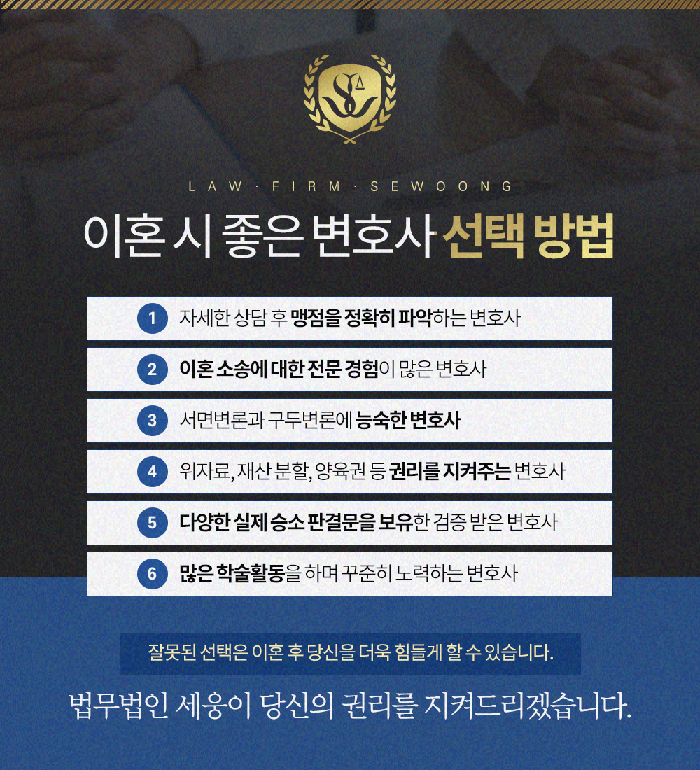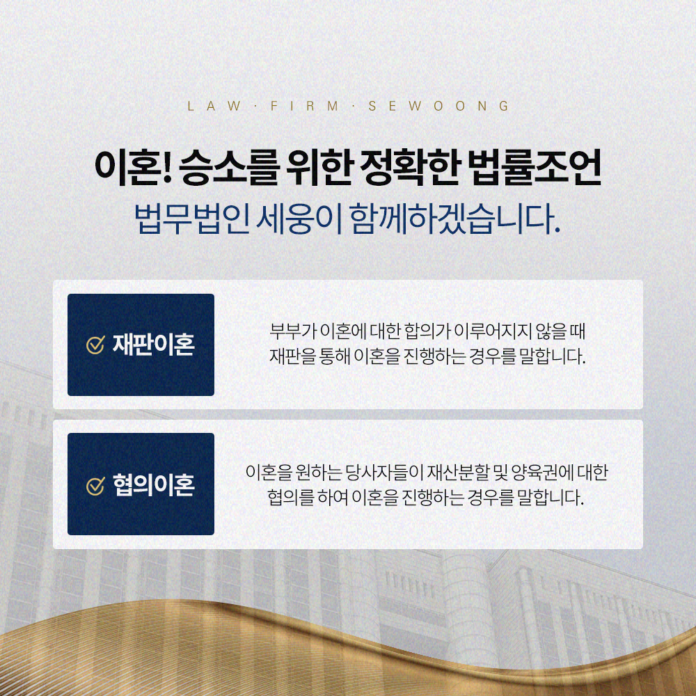 물론 황혼이혼 재산분할은 당사자 사이에 충분한 협의만 있다면 꼭 재판상 이혼 절차를 거치지 않아도 괜찮습니다. 이 경우에도 변호인을 통하여 원만한 협의안을 마련하여 합의이혼을 시도하는 방법도 나쁘지 않은 방법이라고 할 수 있습니다. 감정적으로 대립하고 비법률적인 조정안을 가지고 싸우기보다는 법률전문가의 정확한 의견을 빌려 협의를 하는 방법이 훨씬 나을 수밖에 없기 때문이죠. 이 과정에서 모든 업무를 대변해 줄 신뢰할만한 전문가를 원한다면 너무 부담을 가지지 마시고 편안히 문의를 주시기 바랍니다.