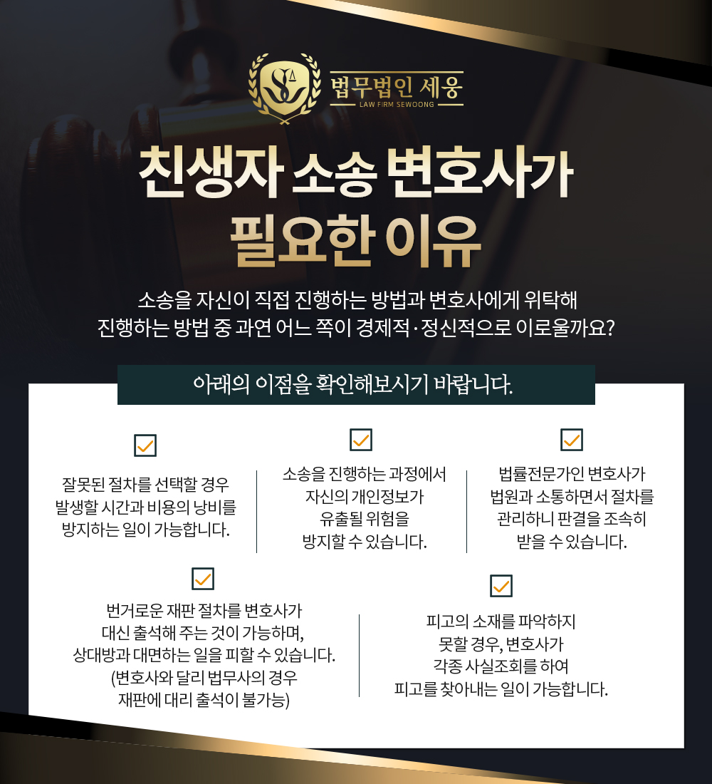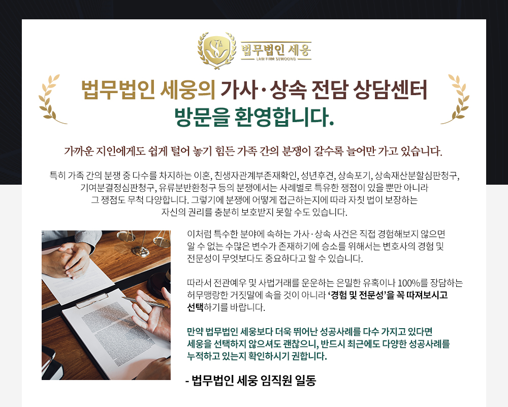 친생자관계부존재확인소송 혹은 친생자관계존재를 확인하는 판결을 받아 그동안 묵혀왔던 법률상 가족관계를 정리하고 싶은 분들은 문의를 주시기 바랍니다. 상속이 개시될 경우 재산분배 문제 등 다양한 법률상 다툼이 발생할 수 있으므로 진실된 가족관계로 가족관계등록부를 정리하는 일을 미리 준비하시길 추천 드립니다.