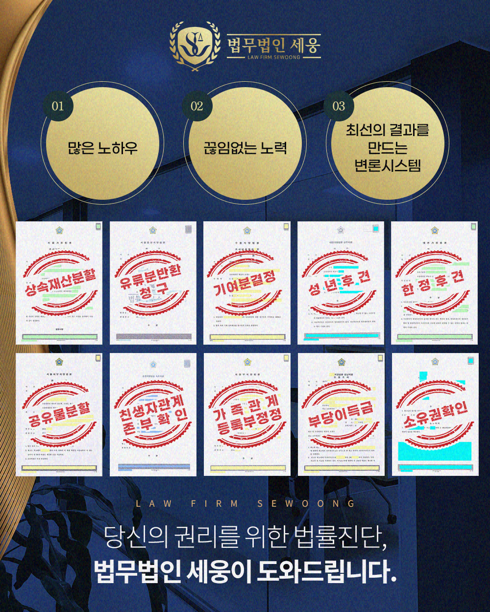 법률사무소 세웅 가사상속상담센터는 친생자관계부존재확인소송에 관하여 숱하게 많은 다양한 성공사례들을 보유하고 있습니다. 비용과 시간을 절감하기 위한 효율적인 소송을 준비하시는 분들은 변호사에게 직접 상담을 받아보기 바랍니다.