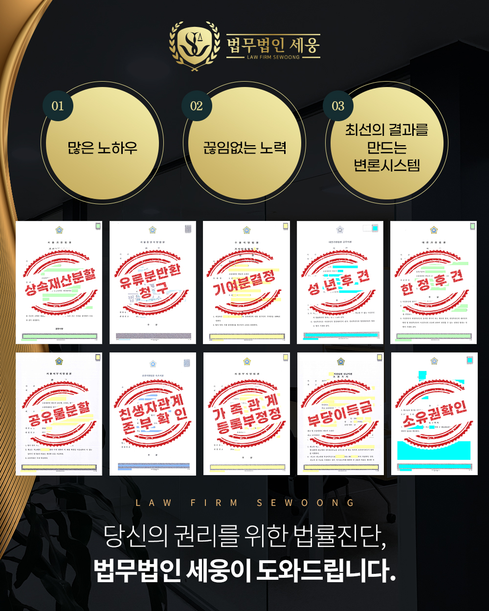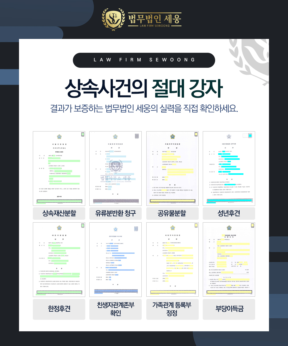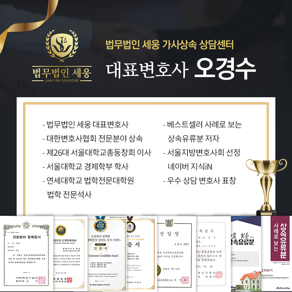 다행히도 법무법인 세웅은 오직 상속분야에 집중하고 있는 상속전문변호사가 주축이 된 상속전담센터를 운영하고 있습니다. 적어도 해당 분야에서 만큼은 최고 수준의 실력을 가지고 있다 자신할 수 있지요. 그리고 그 자신감은 지금까지 쌓아온 많은 성공사례가 입증하고 있습니다. 그러므로 반드시 등록증서에 상속법전문을 확인하시고 도움을 청해보시기 바랍니다. 케케묵은 고민을 시원하게 해결해드리겠습니다.