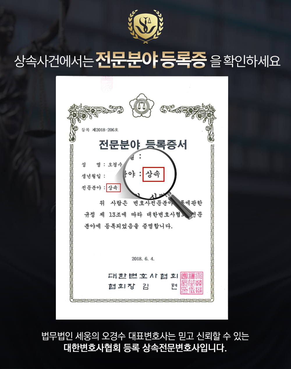 이처럼 상속전문변호사의 역량에 따라 소송당사자가 받아 볼 이득은 큰 차이가 벌어지게 됩니다. 그래서 많은 분들이 상당한 액수의 변호사비용을 감수하더라도 더 많은 이득을 챙길 수 있다는 사실 때문에 전문가를 찾는 수요가 많은 것이죠. 물론 애석하게도 이 분야의 전문가라고 인정받을 수 있는 법조인의 수는 그리 많지 않습니다. 왜냐하면 상속은 매우 특수한 분야로서 대한변호사협회에서도 엄격한 심사규정을 갖추고 있기 때문입니다.