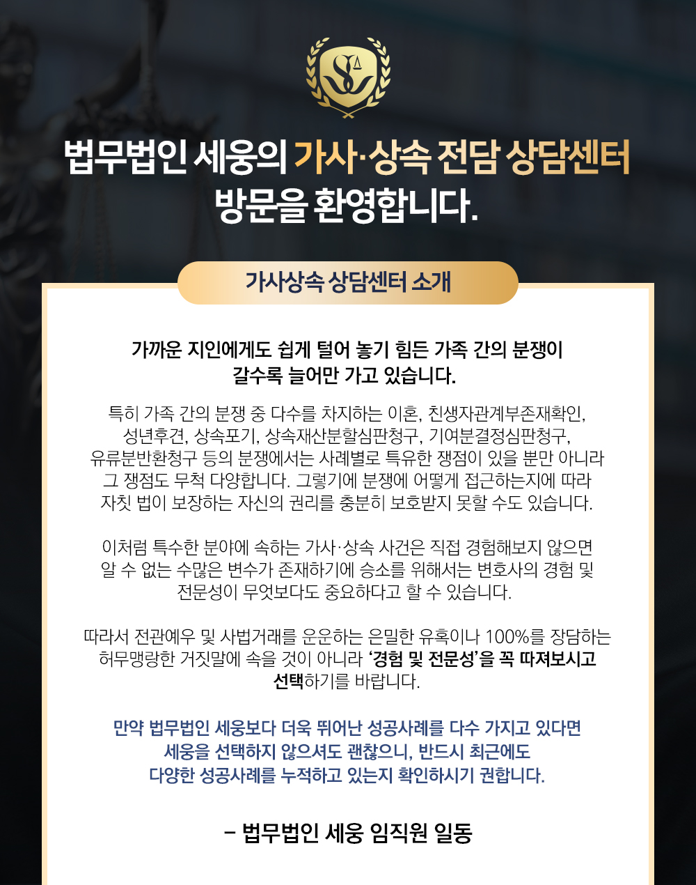 상속 특별대리인 선임신청을 비롯한 상속재산분할 전반에 관해서는 반드시 전문가 조언을 구하시는 게 좋습니다. 비록 상속인들 사이에 다툼이 없더라도 상속재산분할협의서 작성 및 후속처리를 깔끔하게 처리하기 위해서는 전문가 도움이 꼭 필요합니다.