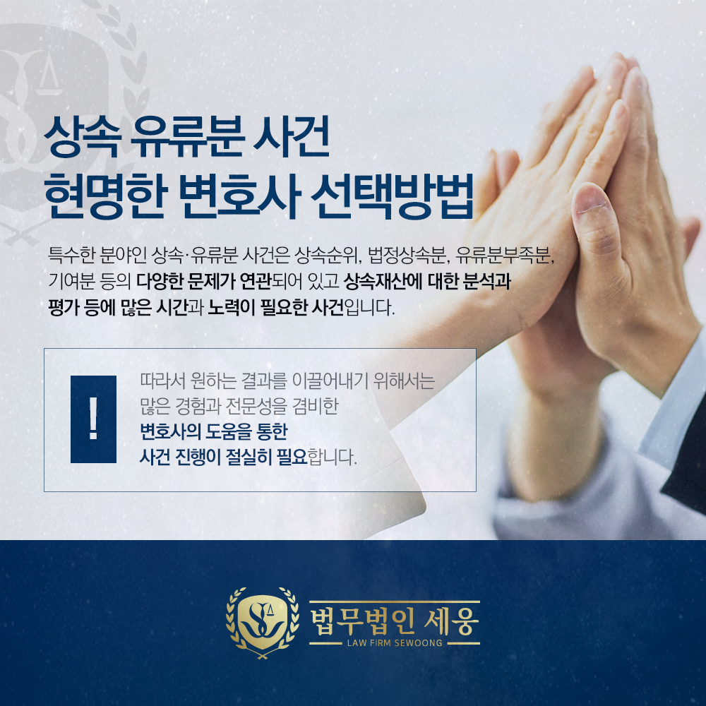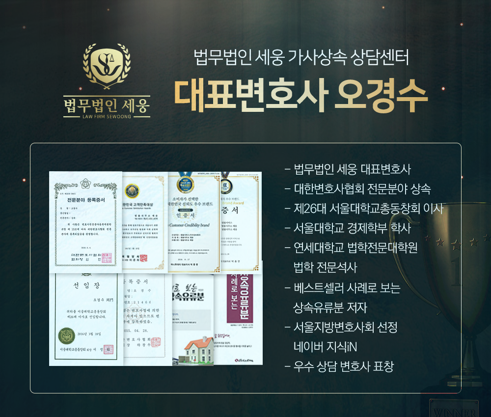 상속과 관련된 모든 법률문제들을, 풍부한 성공경험과 노하우를 통해 세심하고 꼼꼼히 처리할 수 있는 능력이 필수가 되는 시대입니다. 만약 도움이 필요하시다면 지금 바로 필자가 대표변호사로 하여 근무하고 있는 상속전담센터로 연락하여 직접 상담을 받아보시기 바랍니다. 정확하게 사안을 경청하고 다양한 경험에 맞는 최적의 답변을 드릴수 있도록 최선을