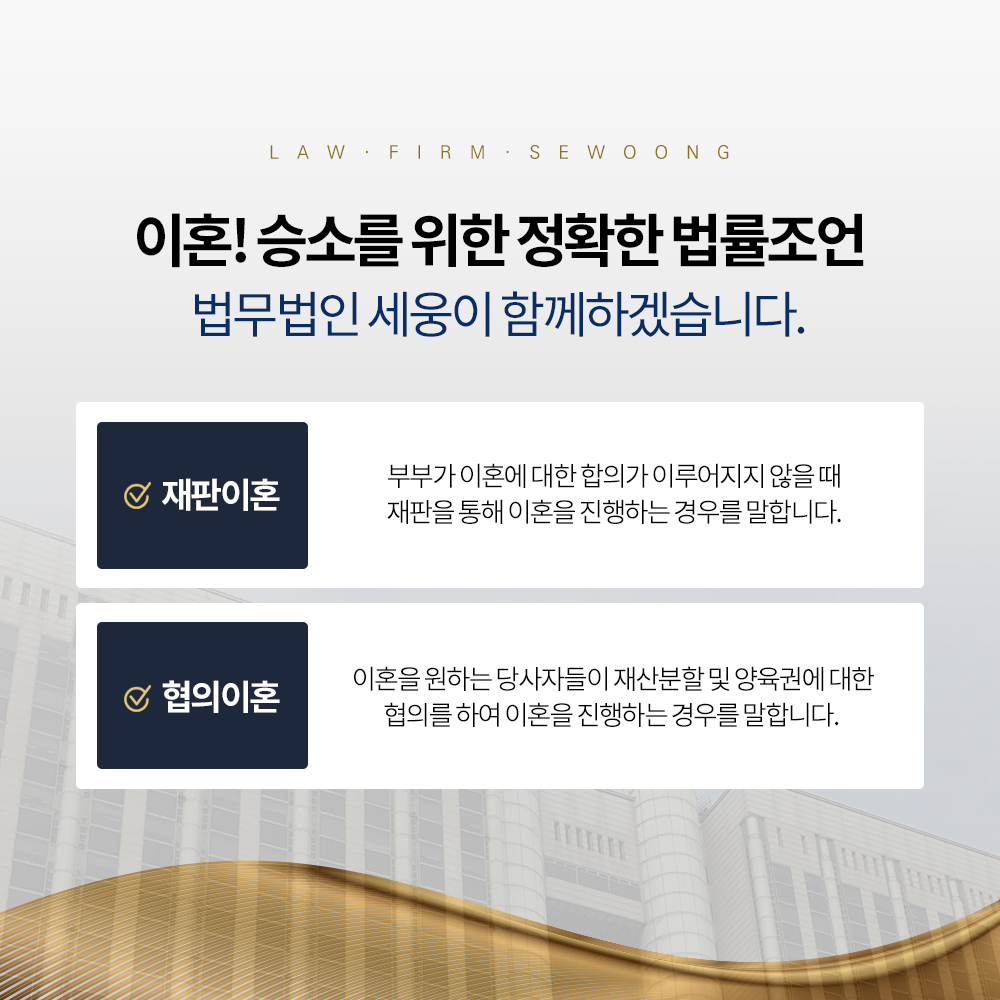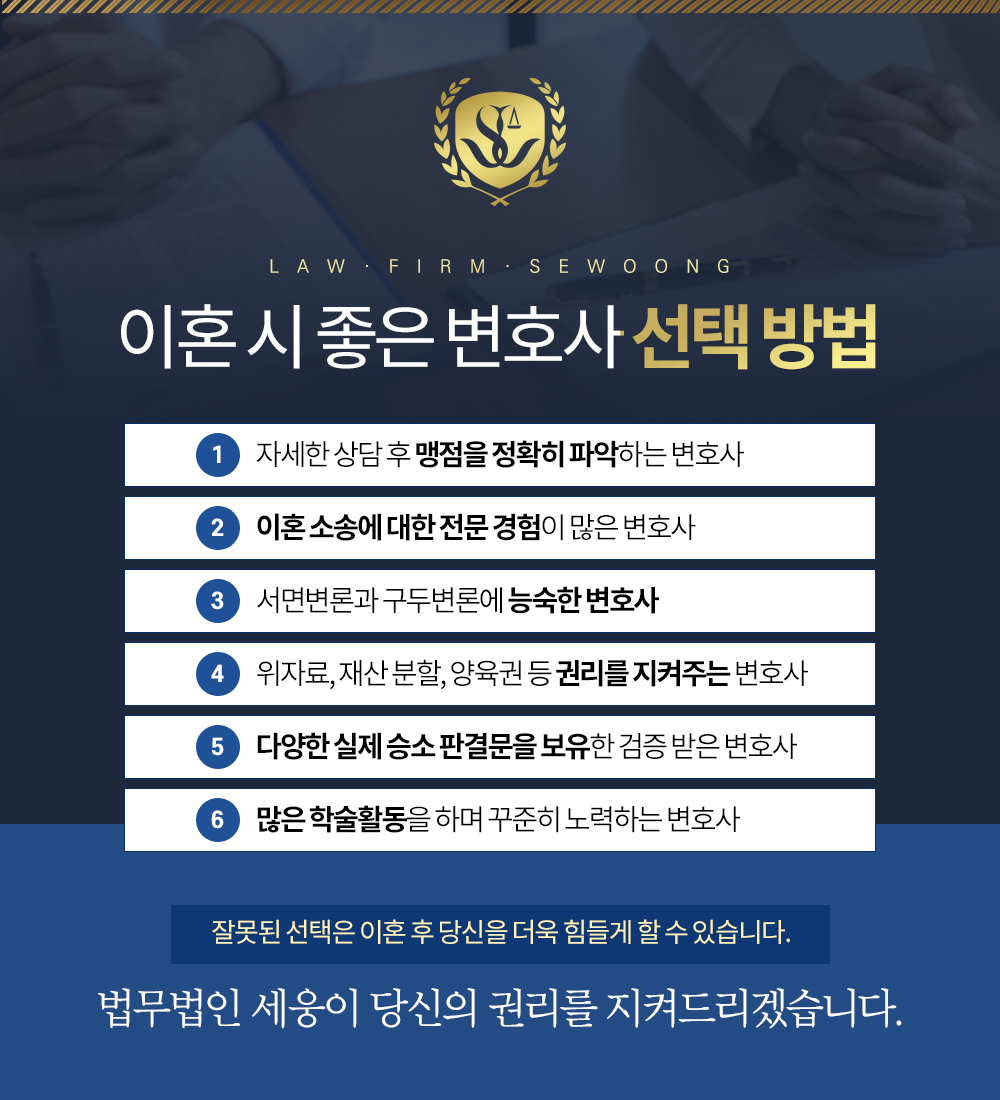 협의이혼 재산분할과 이혼에 대한 법률적인 사항들에 대해 대강 살펴보았는데 100쌍의 부부가 이혼을 한다면 100가지의 이유가 있을 정도로 구체적인 사안에 있어서는 개개인마다 차이가 날 수밖에 없습니다.나에게 꼭 맞는 유리한 협의이혼 재산분할을 위해 또 효과적인 대응책을 찾고자 하신다면, 언제든지 망설이지 말고 당신의 전담변호인 법률사무소 세웅의 무료법률상담을 해 보시기를 권합니다.