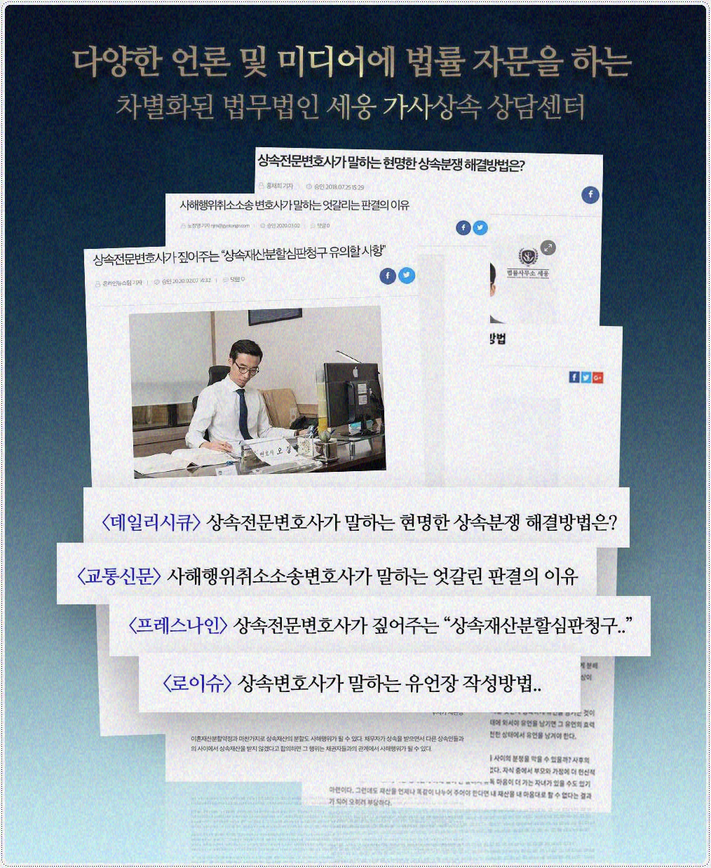 상속 문제는 다른 어떤 소송보다 쟁점이 많고 까다롭다고 말합니다. 지인의 부탁으로 경험도 없이 유산분할소송에 뛰어들었다가 혀를 내두른 변호사도 허다합니다. 상속 문제로 고통 받고 있다면 반드시 처음부터 상속법전문변호사와 상의해야 합니다. 대한변협에서 일정한 조건 아래 ‘전문분야’를 반드시 등록하도록 하는 건 심심해서가 아닙니다. 경험은 거짓말을 하지 않습니다. 상황에 맞는 대책을 가장 빨리 내리는 일은 실전에서 쌓인 경험으로만 할 수 있습니다.